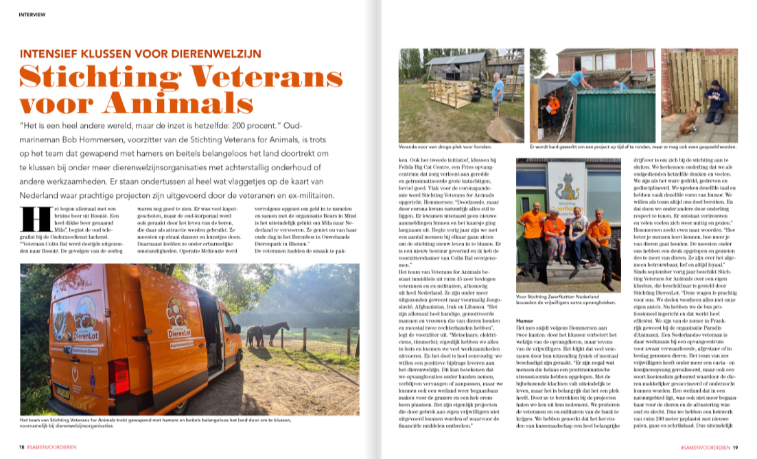 Veterans for Animals is een Nederlandse stichting die veteranen met een hart voor dieren een nieuwe, belangrijke missie geeft: Hulp bieden aan dieren en hun opvangorganisaties. Wij geloven dat de kracht, discipline en kameraadschap van veteranen perfect samengaan met het bieden van hulp aan dieren in nood. Door samen te werken aan projecten bij asielen, opvangcentra en dierenstichtingen, vinden veteranen opnieuw betekenis, structuur en verbondenheid — terwijl dieren de zorg en bescherming krijgen die ze verdienen.